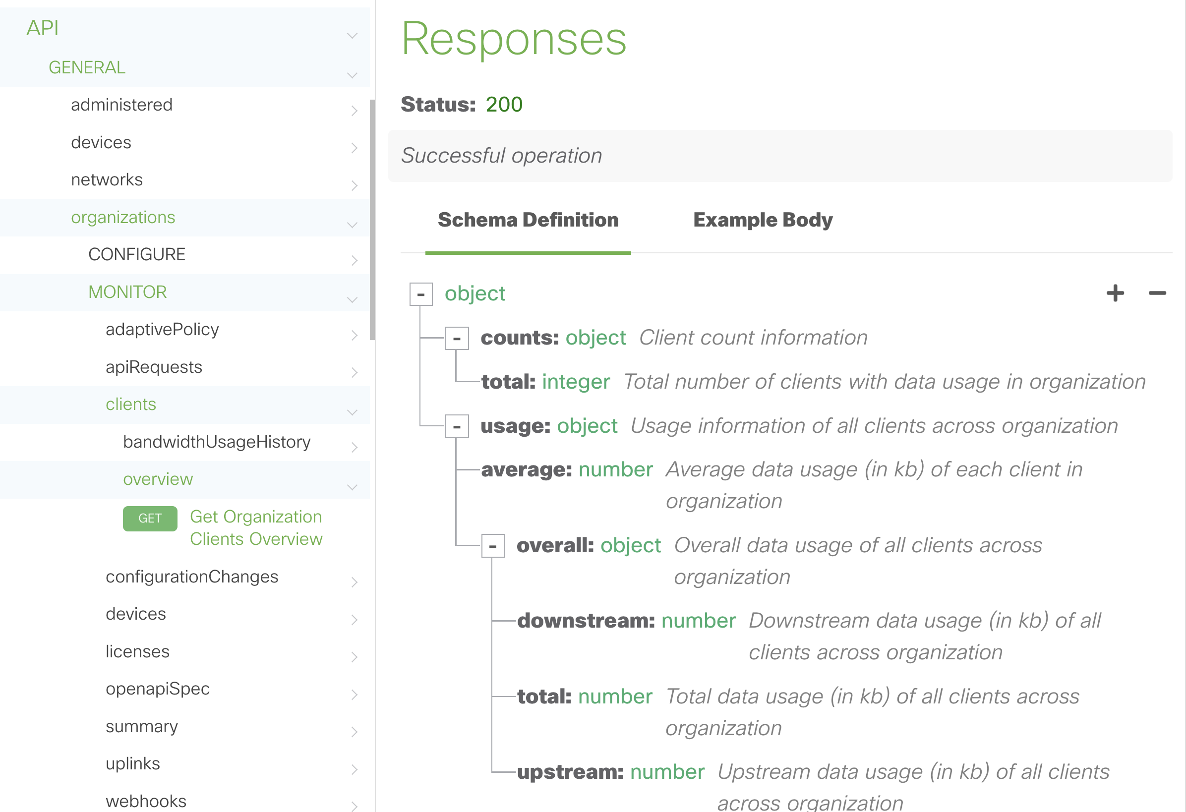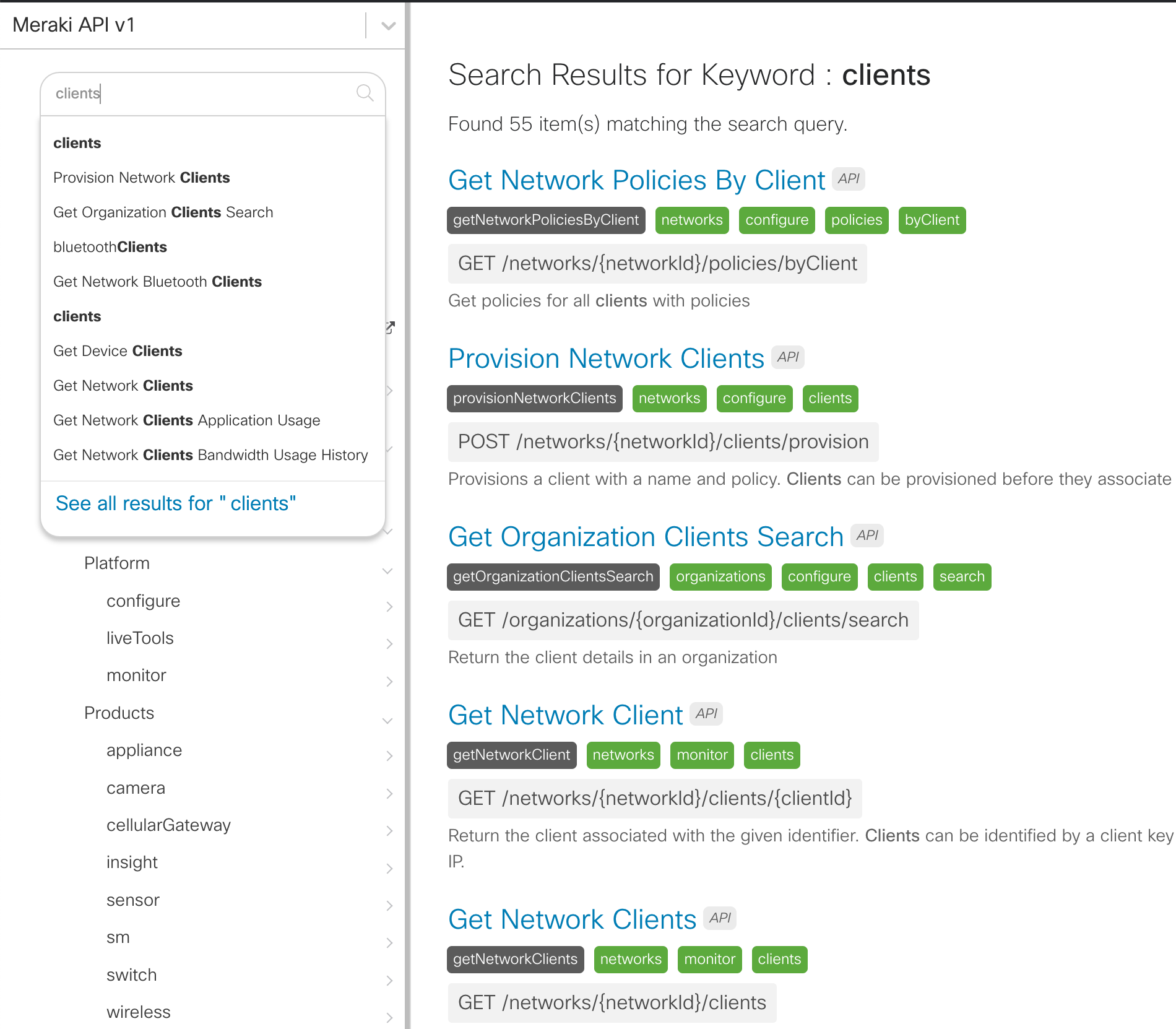 The API Reference section has been adjusted to enable easier discovery of API operations without being concerned with the organizations, networks or devices scope. These core operations along with all other non product specific ones will now live under the Platform folder.