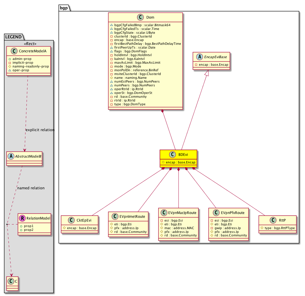 Super Mo: bgp:EncapEviBase, Container Mos: bgp:Dom (deletable:no), Contained Mos: bgp:CktEpEvi, bgp:EVpnImetRoute, bgp:EVpnMacIpRoute, bgp:EVpnPfxRoute, bgp:RttP, |