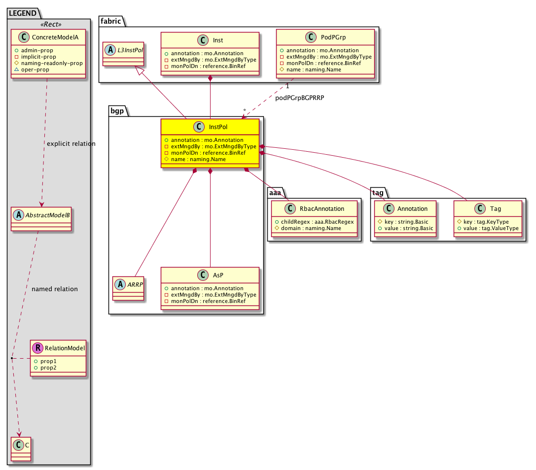 bgp:InstPol The BGP Instance level policy is used to configure MP-BGP policies inside the fabric. |