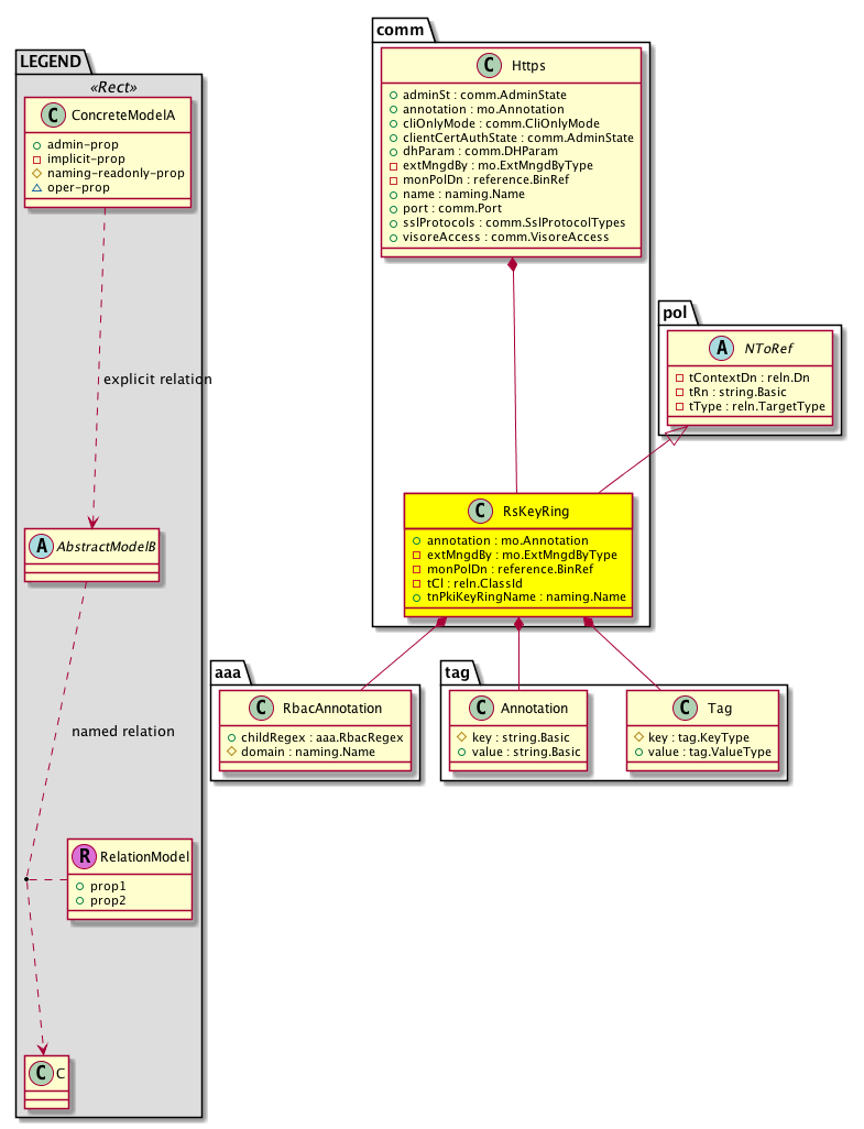 The HTTP connection key ring. Each PKI device holds a pair of asymmetric Rivest-Shamir-Adleman (RSA) encryption keys, one kept private and one made public, stored in an internal key ring.