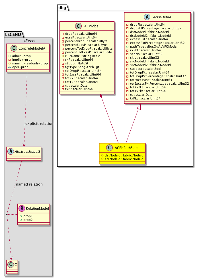 [V] dbg:AcPbDataA Atomic Counter Probe statistics for each path for which this probe is deployed Total count across all linecards in a path is maintained if there are multiple linecards and hence multiple atomic counter block instances in a node Path is directional. ACPbPathStats = Atomic Counter Probe Path Stats Abstract Class.