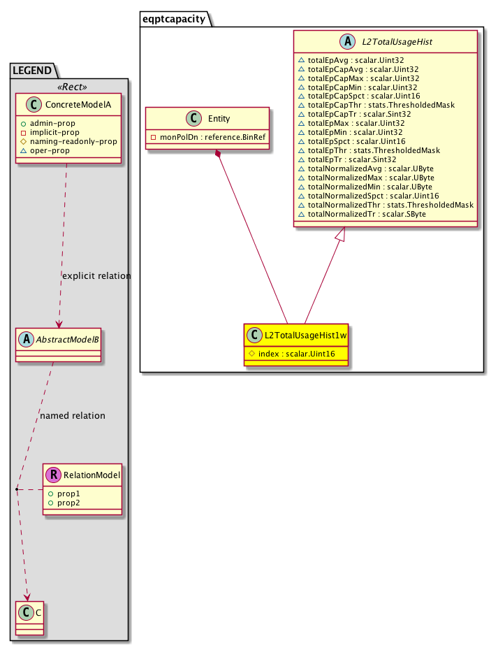 [V] eqptcapacity:L2TotalUsageHist1w Layer2 total entries usage statistics. A class that represents historical statistics for Layer2 total entries usage count in a 1 week sampling interval. This class updates every day.