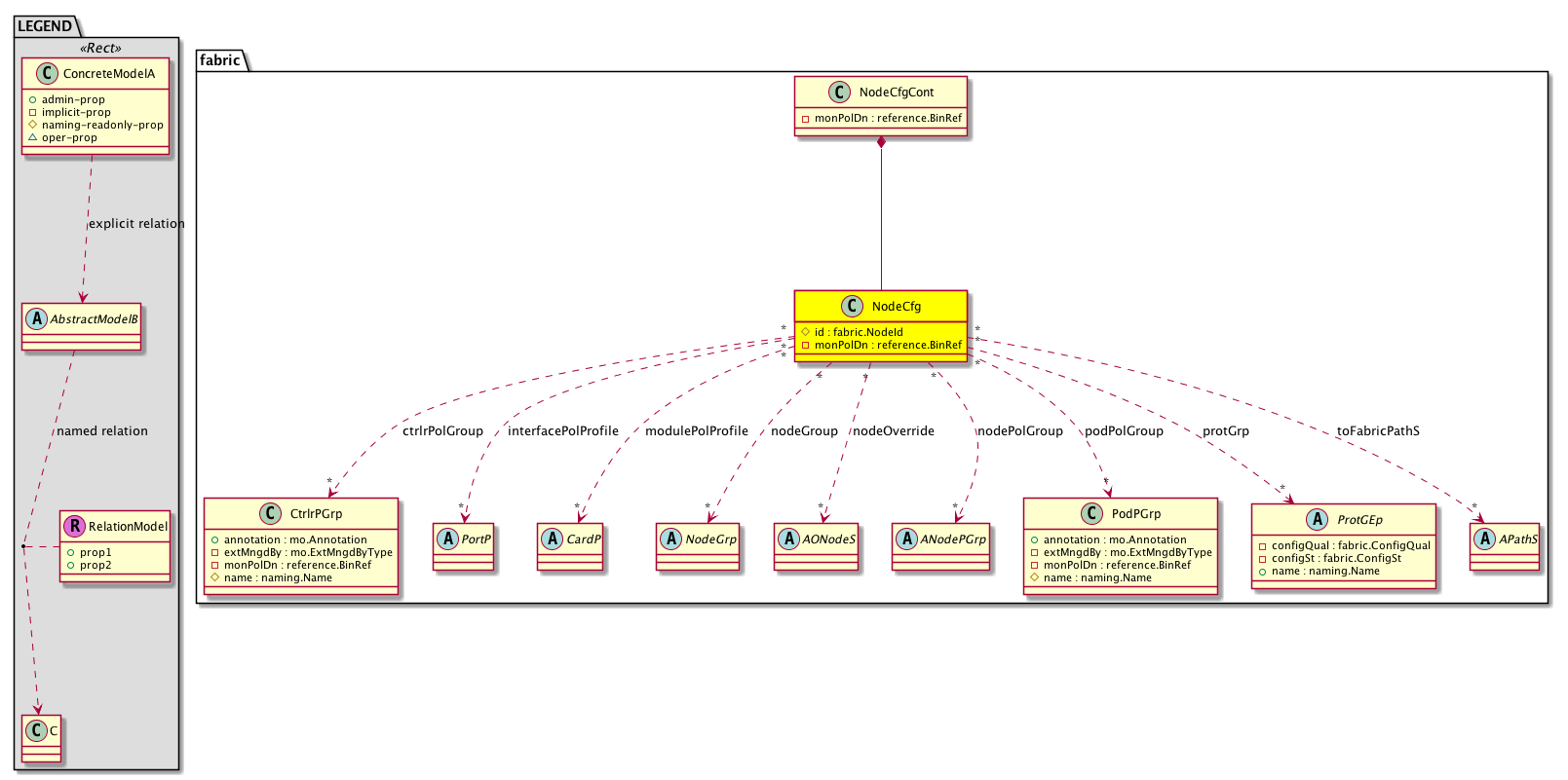 [V] fabric:NodeCfg An internal object that contains relations to the pod/node/module/interface configuration to be deployed on each node.