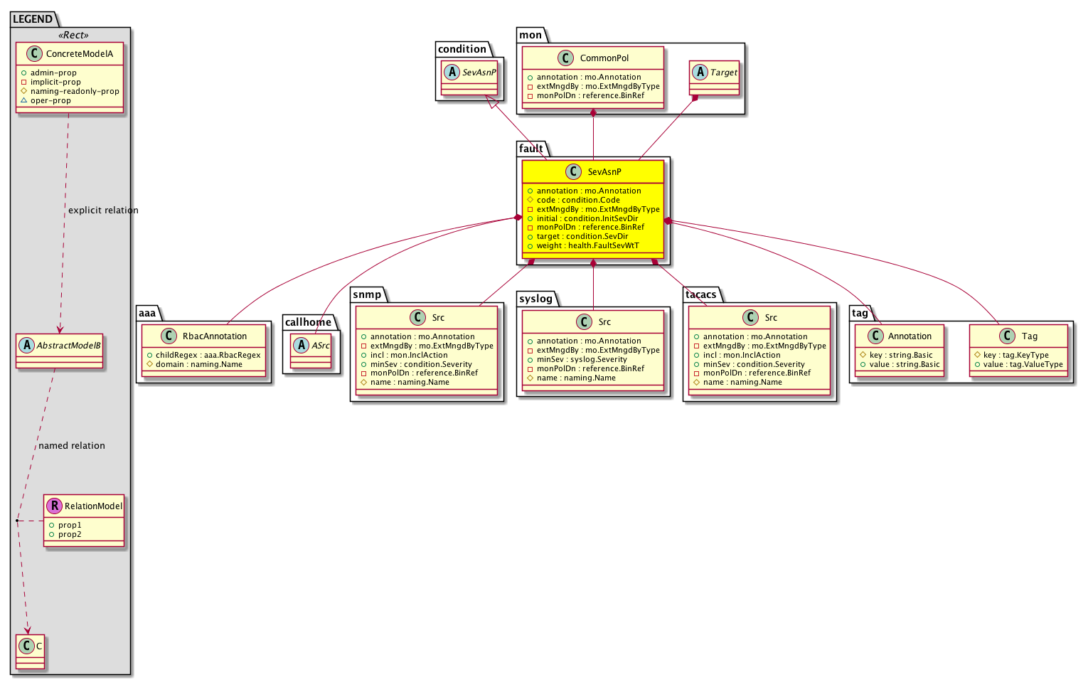 fault:SevAsnP The initial and target severities for a specific fault can be specified in a custom or default monitoring policy directly under an observable target object. |