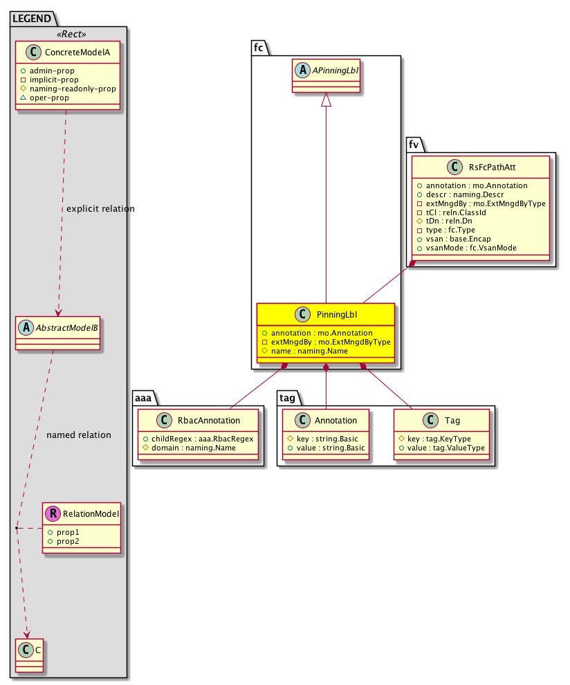 [V] fc:APinningLbl  Fiber Channel Pinning Label. Its used for pinning host interfaces to uplink interfaces. This label should match with the name of a fc:PinningP configured this tenant or tenant-commmon. Once this label is configured under a fv:RsFcPathAtt, that host interface will get pinned to the uplink interfaces specified in the Pinning profile.