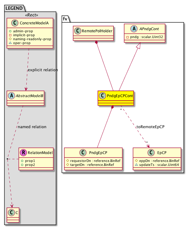 [V] fv:RemotePolHolder A container existing on each node to efficiently download policies to the node. For example: filters, bridge domain, and taboo policies. This is an internal object.