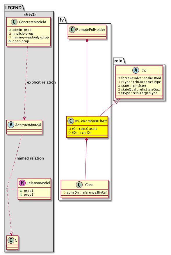 [V] fv:RemotePolHolder A container existing on each node to efficiently download policies to the node. For example: filters, bridge domain, and taboo policies. This is an internal object.