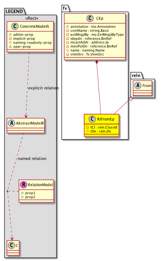 fv:RtFromEp A target relation to the properties of the client defined endpoint attached to the network. This is an internal object. |