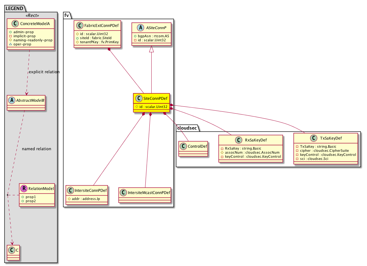 Super Mo: fv:ASiteConnP, Container Mos: fv:FabricExtConnPDef (deletable:yes), Contained Mos: cloudsec:ControlDef, cloudsec:RxSaKeyDef, cloudsec:TxSaKeyDef, fv:IntersiteConnPDef, fv:IntersiteMcastConnPDef, |