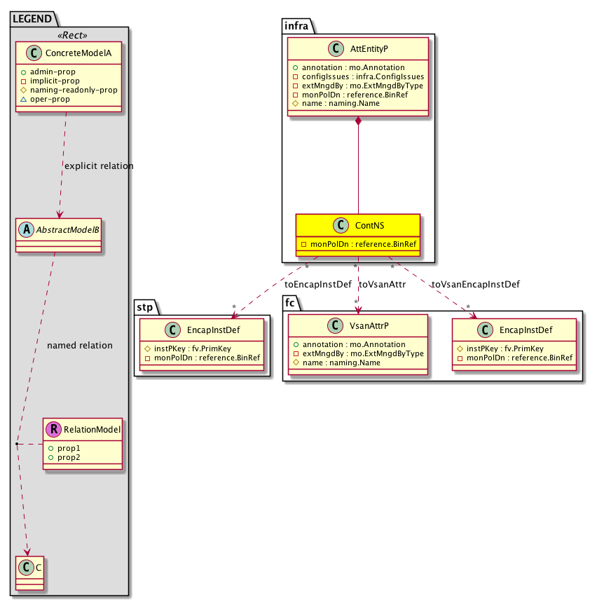 Relations: infra:RsToEncapInstDef, infra:RsToVsanAttr, infra:RsToVsanEncapInstDef,