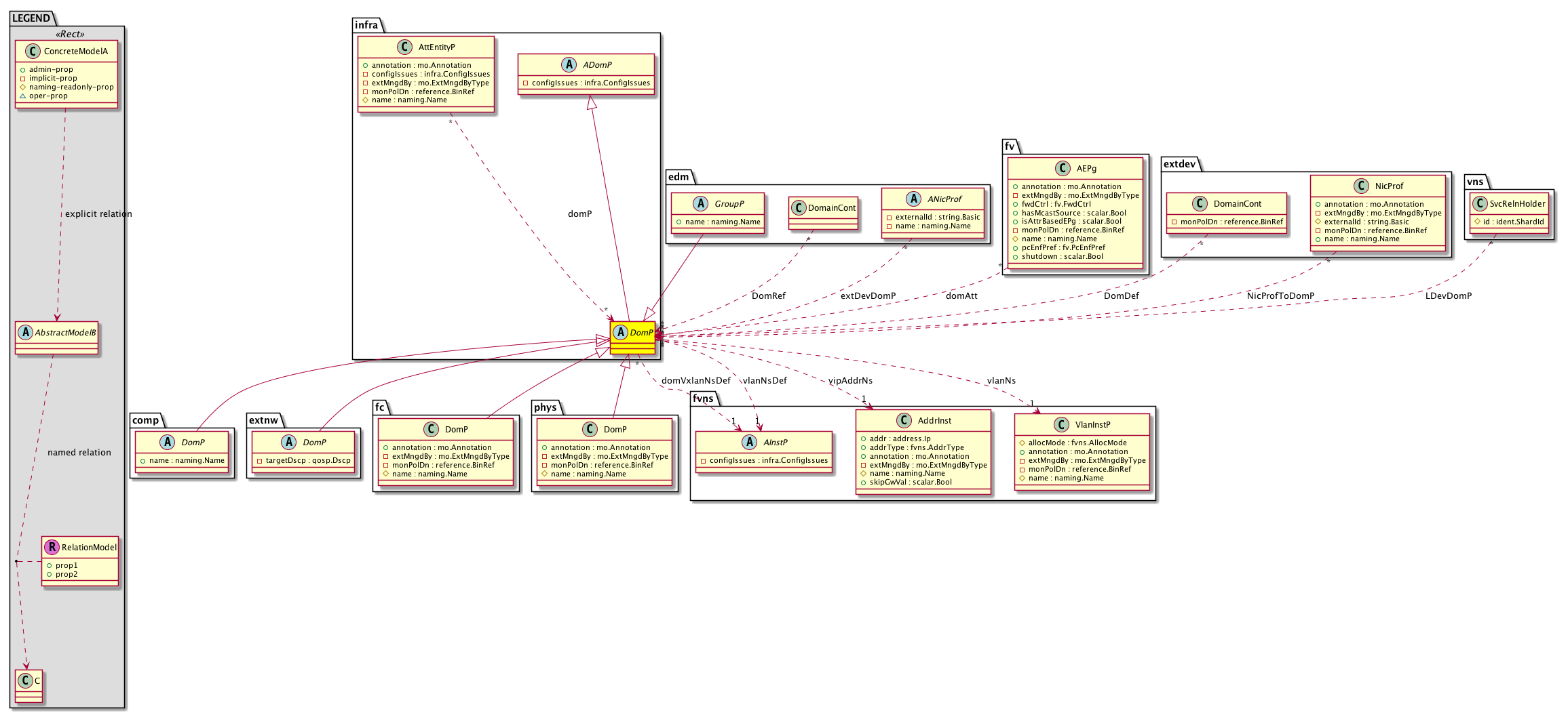 Relations: infra:RsDomVxlanNsDef, infra:RsVipAddrNs, infra:RsVlanNs, infra:RsVlanNsDef, infra:RtDomAtt, infra:RtDomDef, infra:RtDomP, infra:RtDomRef, infra:RtExtDevDomP, infra:RtLDevDomP, infra:RtNicProfToDomP,