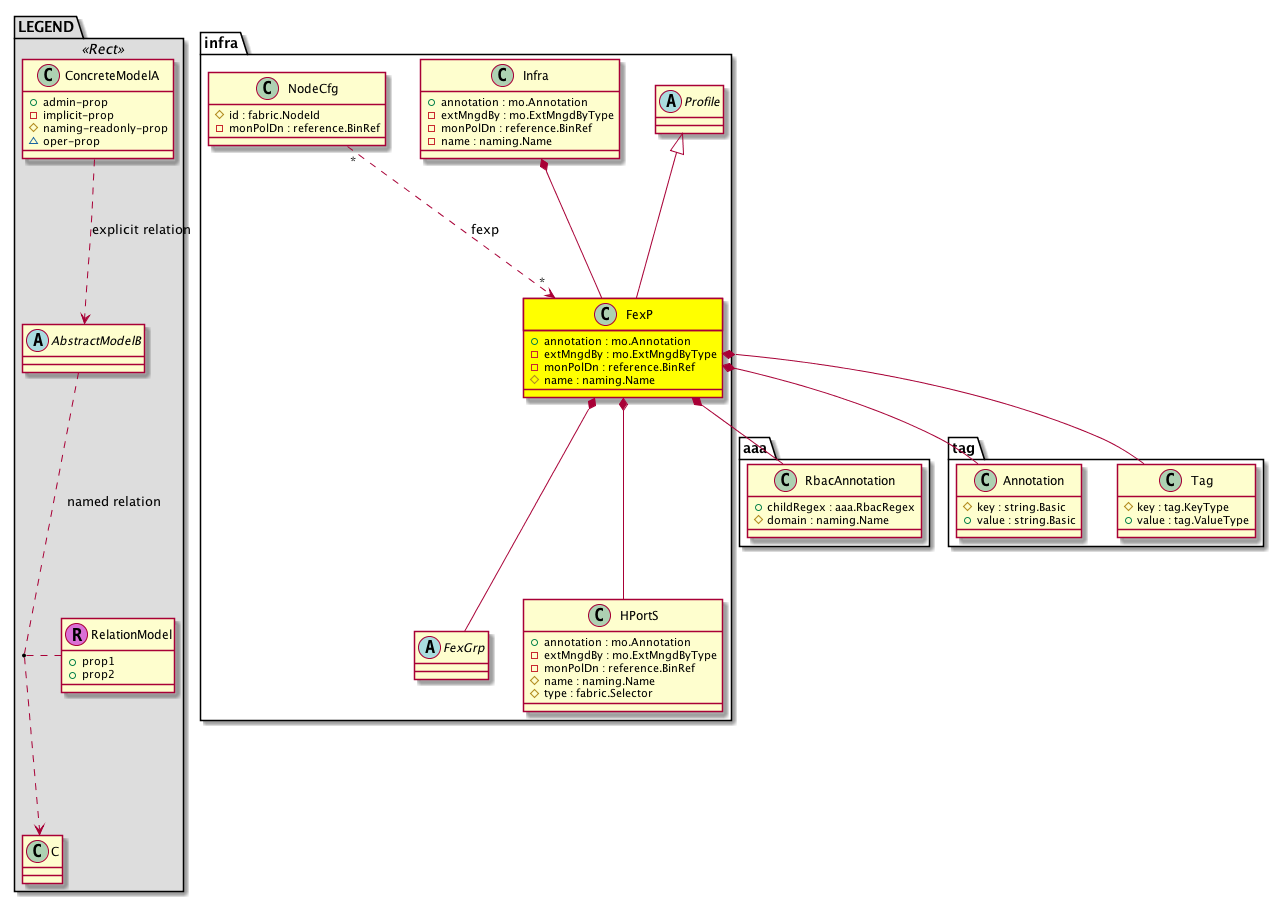 infra:FexP The FEX profile enables you to configure FEX interfaces. |