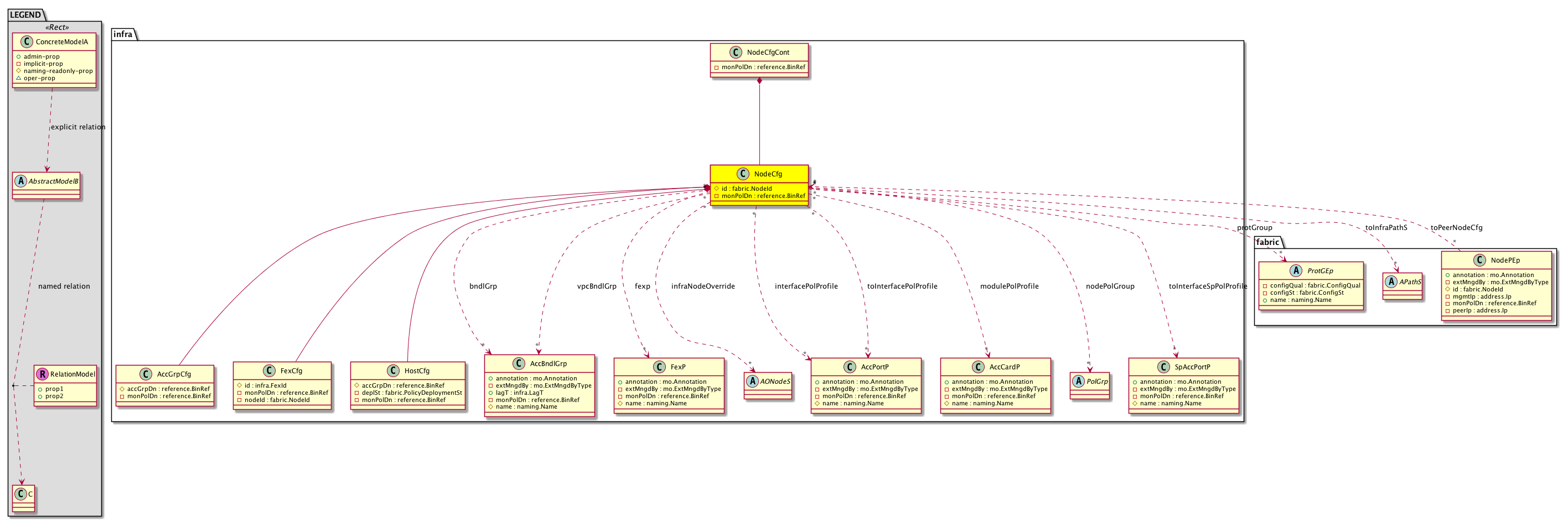 infra:NodeCfg An internal object used by APIC to keep track of the infra configuration per node. |