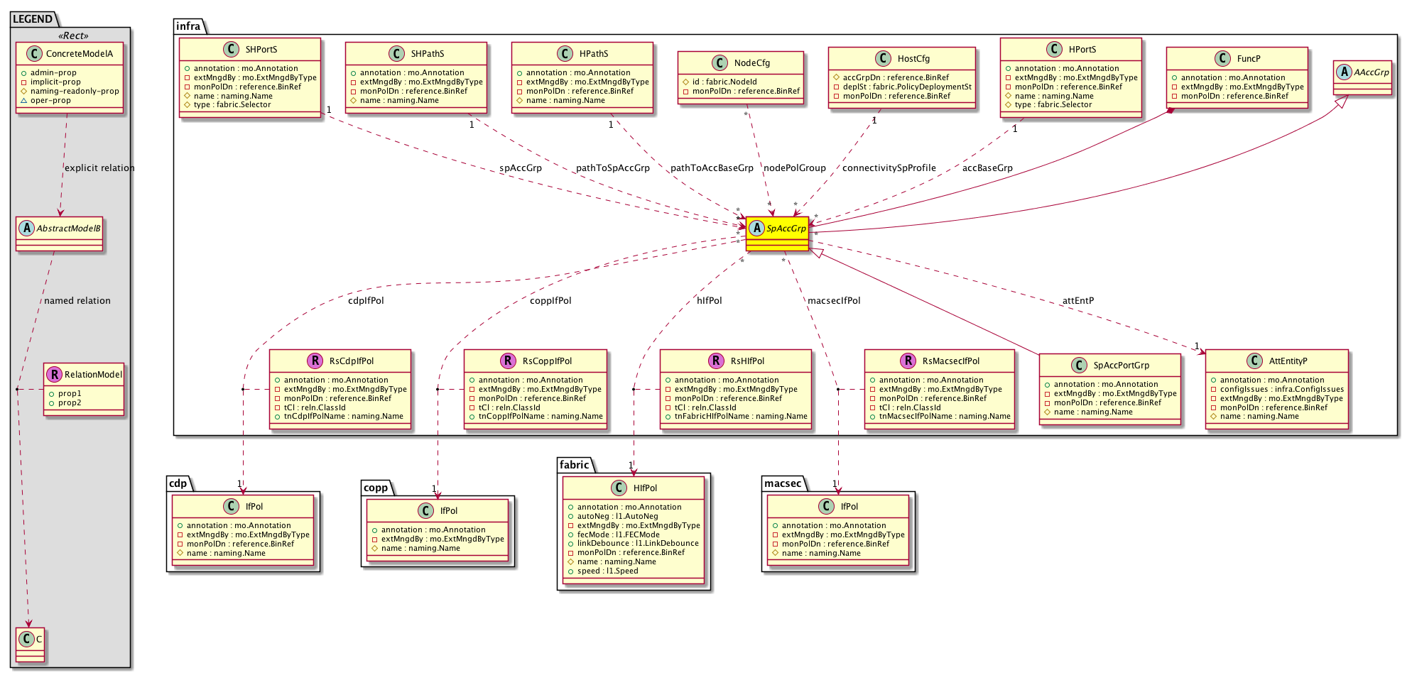 Relations: infra:RsAttEntP, infra:RsCdpIfPol, infra:RsCoppIfPol, infra:RsHIfPol, infra:RsMacsecIfPol, infra:RtAccBaseGrp, infra:RtConnectivitySpProfile, infra:RtNodePolGroup, infra:RtPathToAccBaseGrp, infra:RtPathToSpAccGrp, infra:RtSpAccGrp,