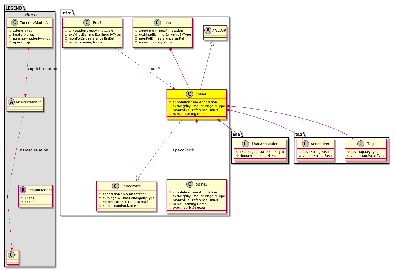 [V] infra:SpineP  Spine Profile Spine Access Policy: It represents the template used for deploying node access configuration (ex. Configuration for connecting hypervisor, Fex, External network )