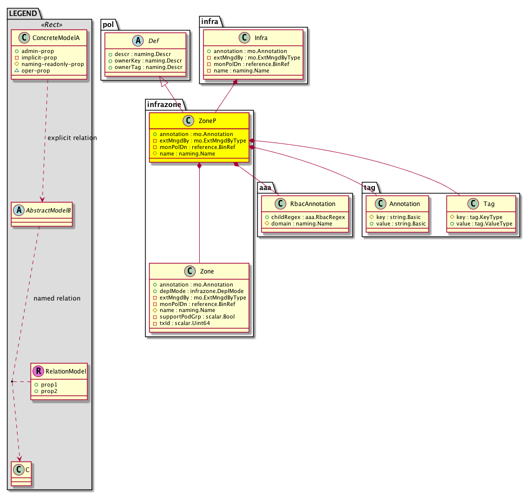 infrazone:Zone Infrastructure Zone: Represents a policy deployment zone in the fabric. A zone consists of member nodes |