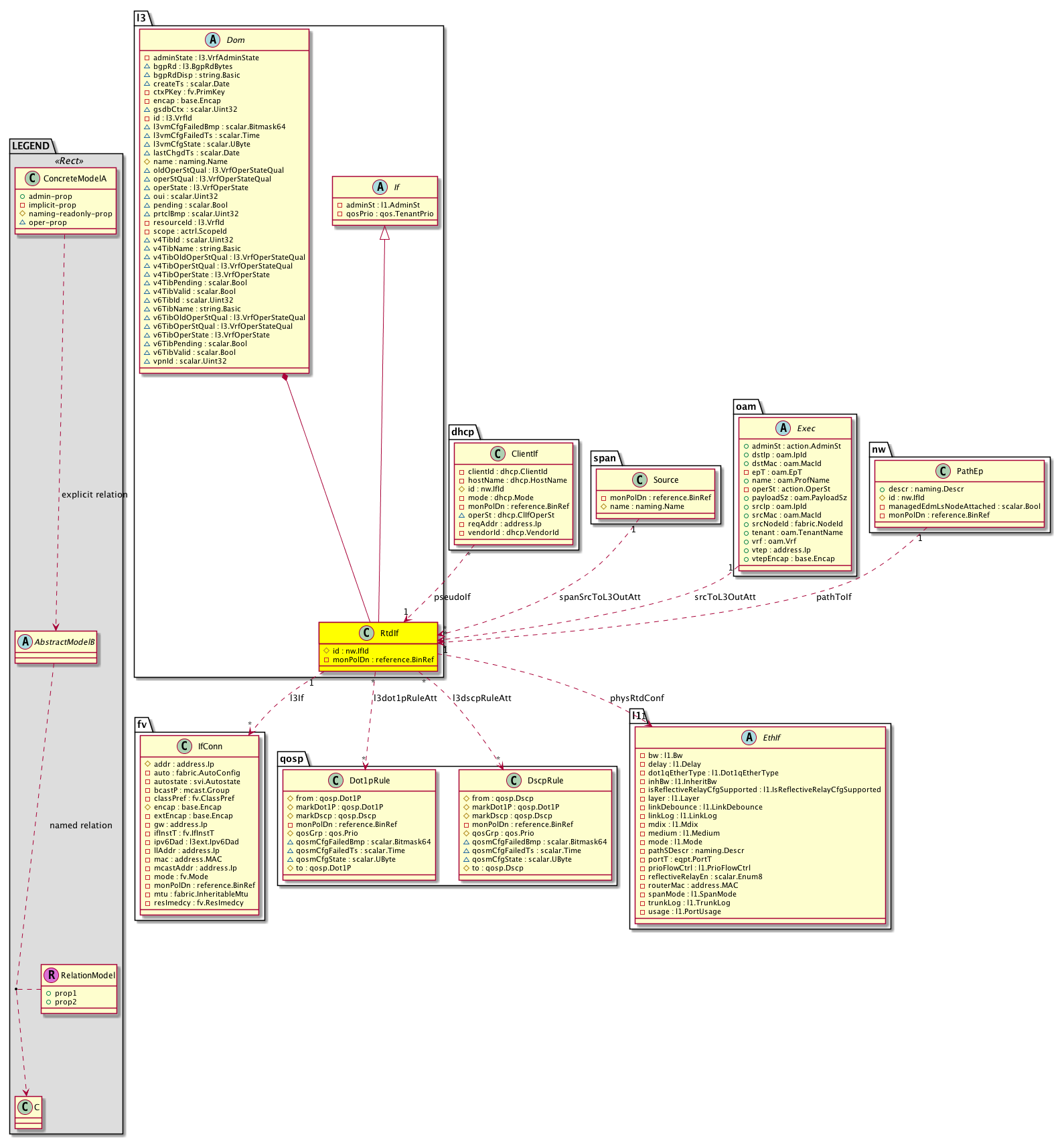 Super Mo: l3:If, Container Mos: l3:Dom (deletable:no), Relations From: dhcp:ClientIf, span:Source, oam:Exec, nw:PathEp, Relations To: fv:IfConn, qosp:Dot1pRule, qosp:DscpRule, l1:EthIf, Relations: l3:RsL3If, l3:RsL3dot1pRuleAtt, l3:RsL3dscpRuleAtt, l3:RsPhysRtdConf, l3:RtPseudoIf, l3:RtSpanSrcToL3OutAtt, l3:RtSrcToL3OutAtt, nw:RtPathToIf, |