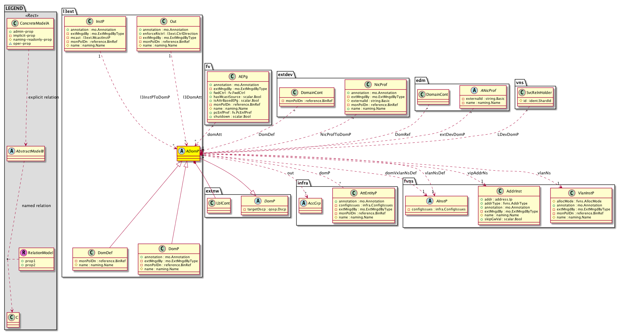 [V] l3ext:ADomP The abstraction of the external routed domain profile, which is a policy for managing the physical infrastructure, such as ports/VLANS, that can be used by an L3 routed outside network.