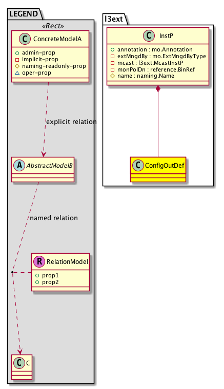 [V] l3ext:InstP The external network instance profile represents a group of external subnets that have the same security behavior. These subnets inherit contract profiles applied to the parent instance profile. Each subnet can also associate to route control profiles, which defines the routing behavior for that subnet.