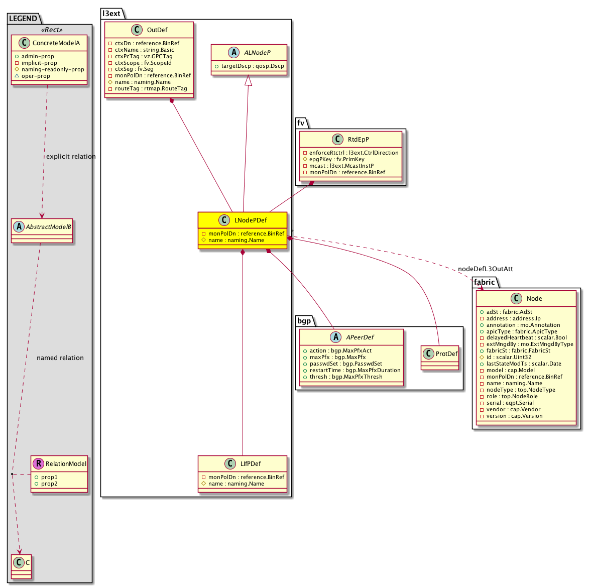 l3ext:RsNodeDefL3OutAtt The object used for creating a static association with a fabric node. Existence of this implies that the corresponding set of policies will be resolved into the node pointed to by the relationship. |