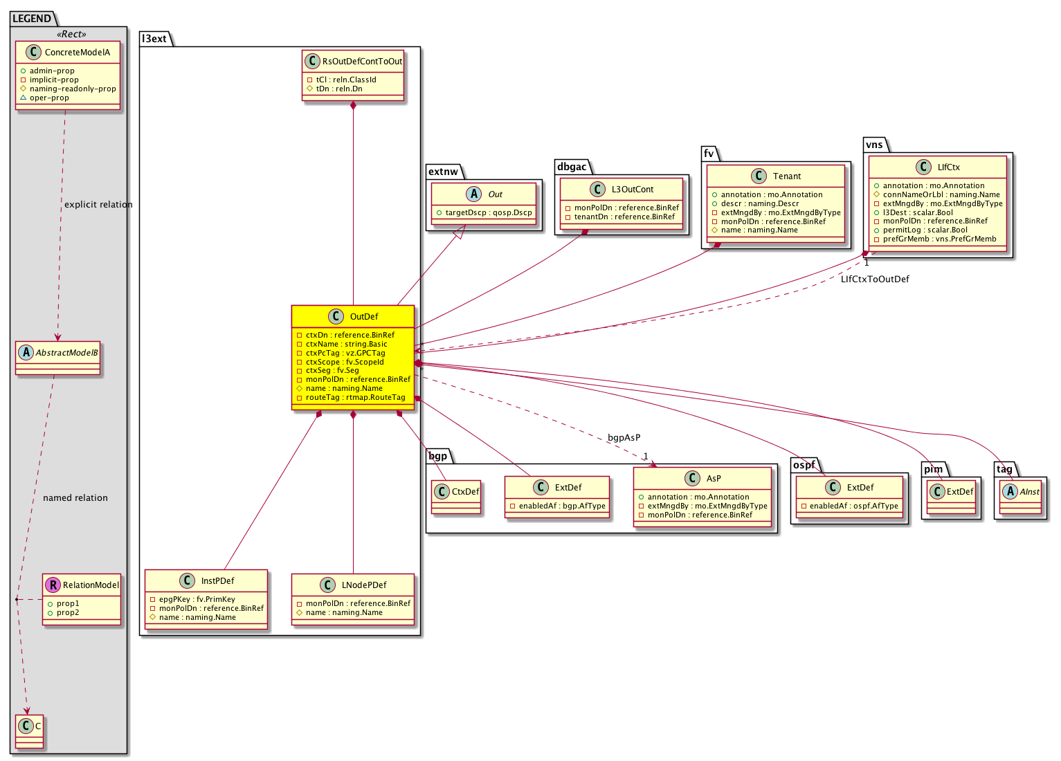 l3ext:RsNodeDefL3OutAtt The object used for creating a static association with a fabric node. Existence of this implies that the corresponding set of policies will be resolved into the node pointed to by the relationship. |