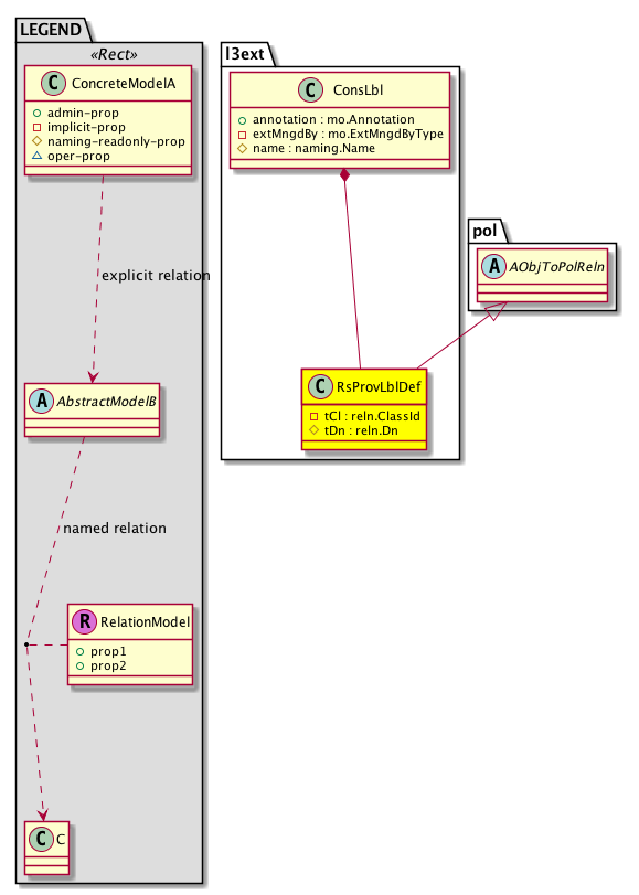 [V] l3ext:ConsLbl  Represents Logical Outside Profile Consumer Label. Defines the characteristics that will be applied to Layer3 Outside that matches with the label name