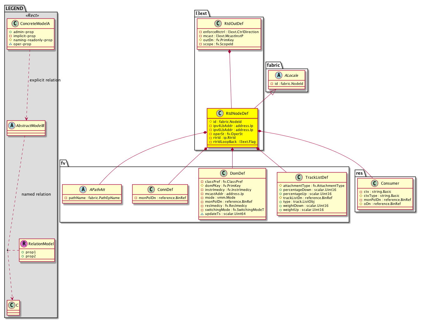 ip:RouteDef The route definitions, which are are used for pushing subnets and static routes to PE. They also push subnets under EpPD to VMMMGR