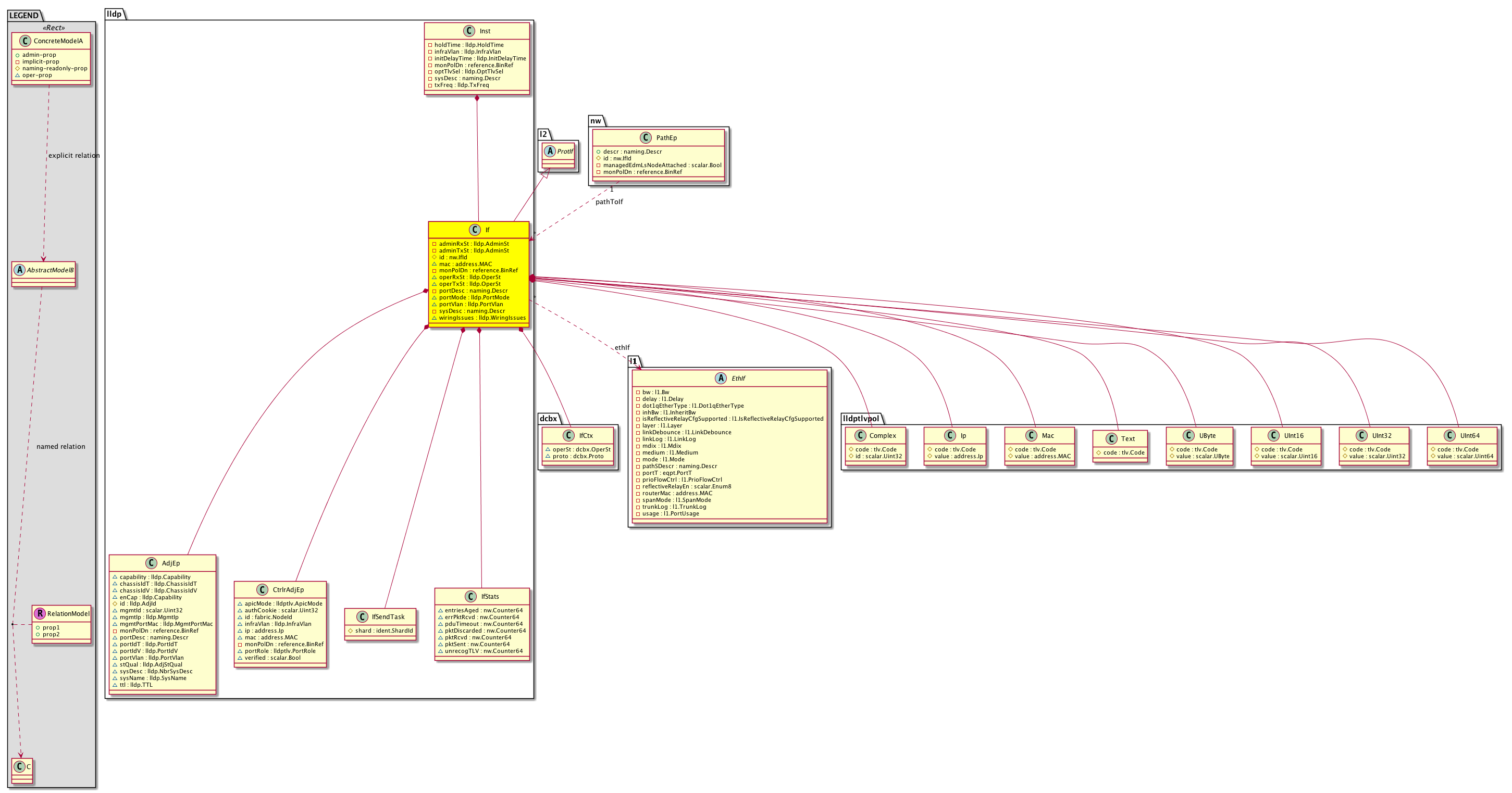 Super Mo: l2:ProtIf, Container Mos: lldp:Inst (deletable:no), Contained Mos: dcbx:IfCtx, lldp:AdjEp, lldp:CtrlrAdjEp, lldp:IfSendTask, lldp:IfStats, lldptlvpol:Complex, lldptlvpol:Ip, lldptlvpol:Mac, lldptlvpol:Text, lldptlvpol:UByte, lldptlvpol:UInt16, lldptlvpol:UInt32, lldptlvpol:UInt64, Relations From: nw:PathEp, Relations To: l1:EthIf, Relations: l2:RsEthIf, nw:RtPathToIf, |