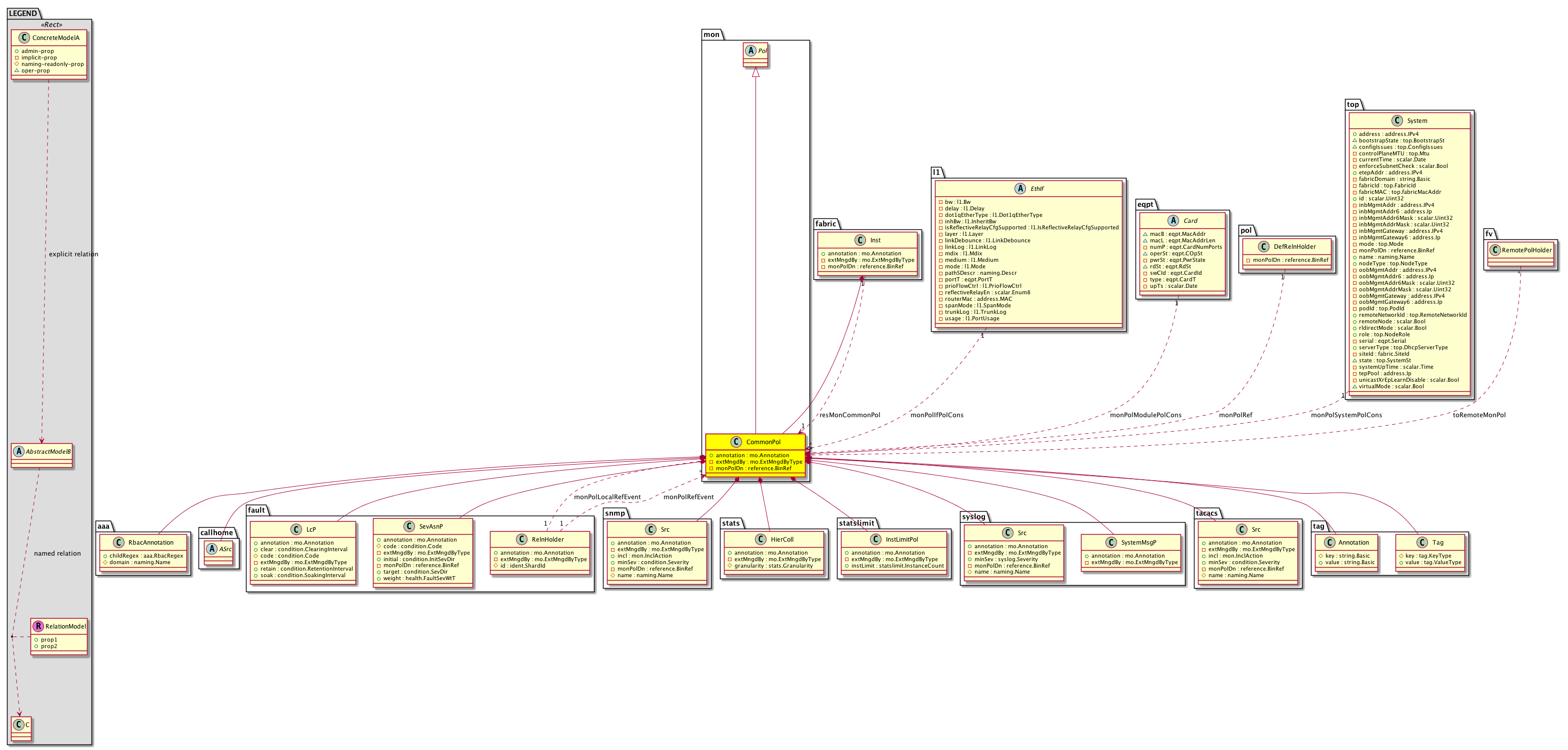mon:CommonPol The monitoring policy model for the common semantic scope, which is used when there is no corresponding policy under the more specific infra or tenant scopes. In such cases, these policies are used throughout the fabric except for objects attached to their own specific policies. |