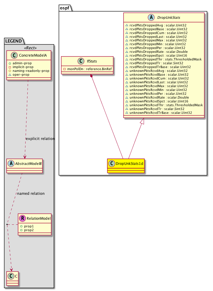 [V] ospf:DropUnkStats1d Ospf Drop Unknown Packet Counters. A class that represents the most current statistics for Ospf Drop Unknown Packets in a 1 day sampling interval. This class updates every hour.