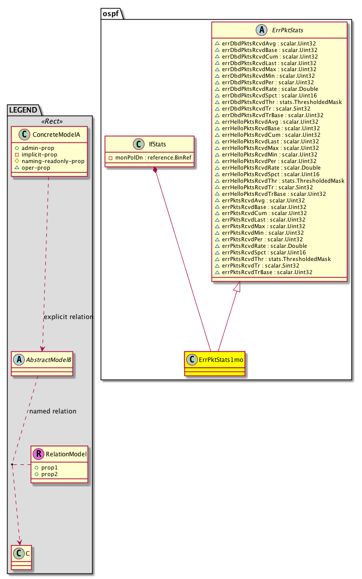 [V] ospf:ErrPktStats1mo Ospf Received Packet Counters. A class that represents the most current statistics for Ospf Error Packets in a 1 month sampling interval. This class updates every day.