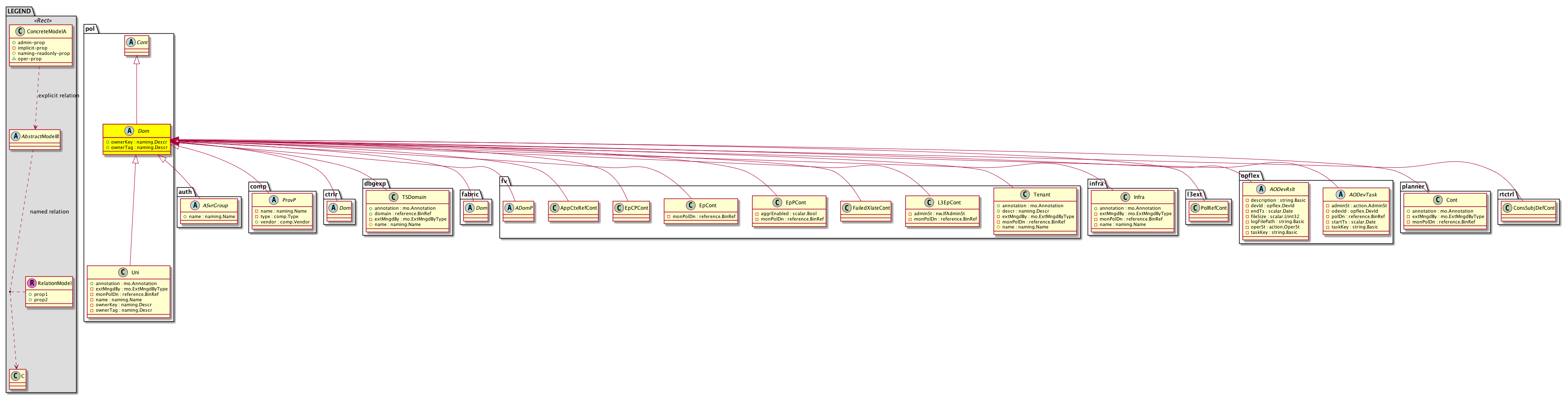 infra:DomP An abstraction of an infrastructure domain profile associated with application endpoint groups. This is used for carving the infra elements including, but not limited to, port, VLAN, etc. |