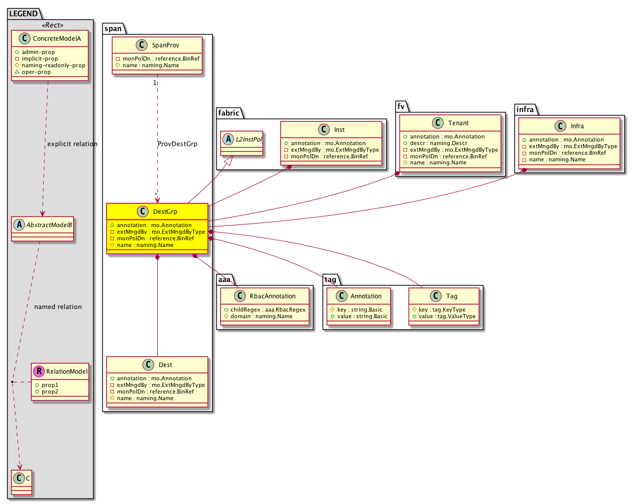 span:DestGrp The SPAN destination group contains a group of SPAN destinations. A SPAN destination is where network traffic is sent for analysis by a network analyzer. A SPAN destination can be local or remote (ERSPAN). When you create a traffic monitoring session, you must select a SPAN source and a SPAN destination. The type of session (Tenant, Access, or Fabric) determines the allowed types of SPAN sources and destinations. The destination can be either a p... |