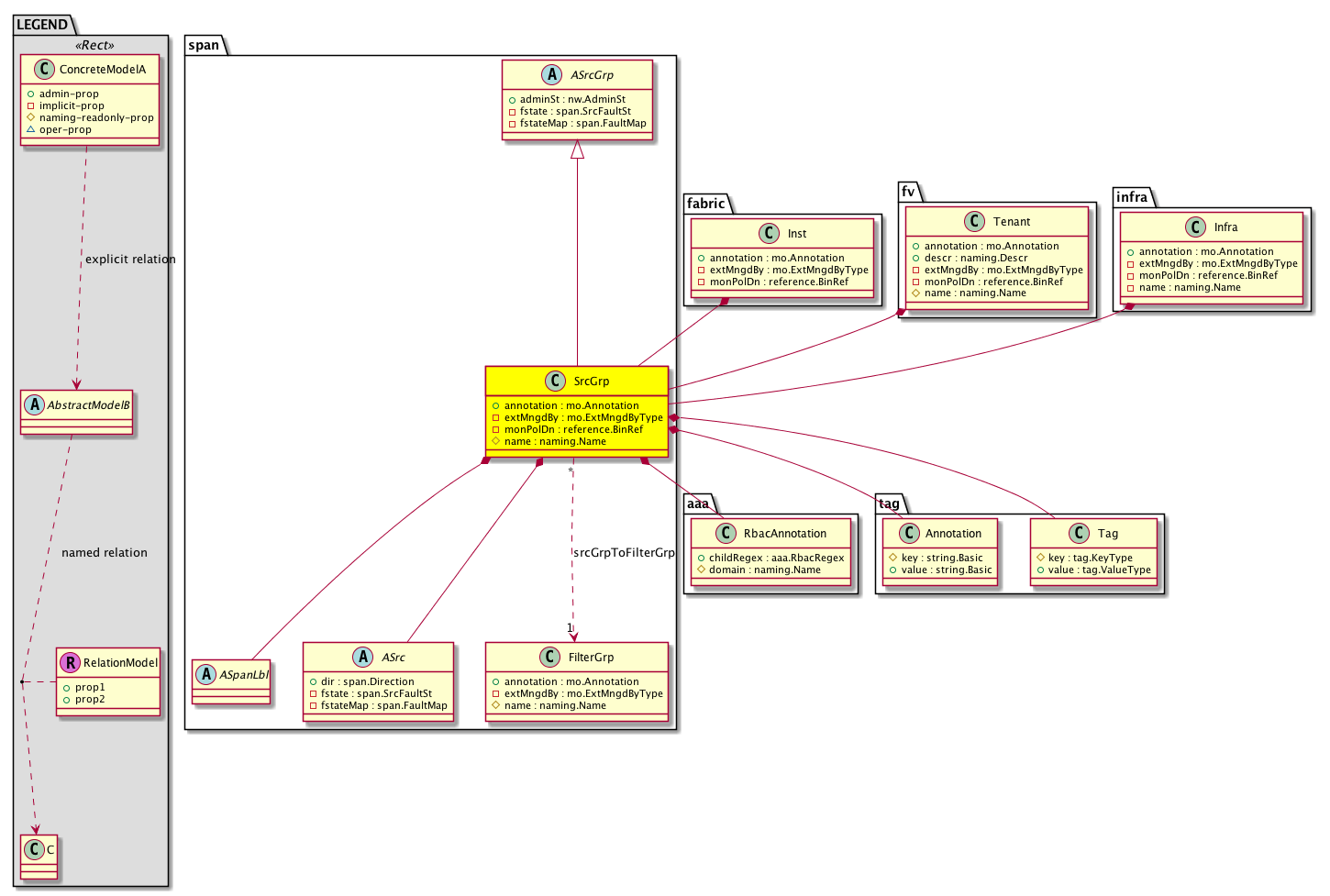 span:ASrc The abstraction of an SPAN source. The SPAN source is where traffic is sampled. A source can be an endpoint group (EPG), one or more ports, or port traffic filtered by an EPG (Access SPAN), a Layer 2 bridge domain, or a Layer 3 context (Fabric SPAN). When you create a traffic monitoring session, you must select a SPAN source and a SPAN destination. The type of session (Tenant, Access or fabric) determines the allowed types of SPAN sources and de... |