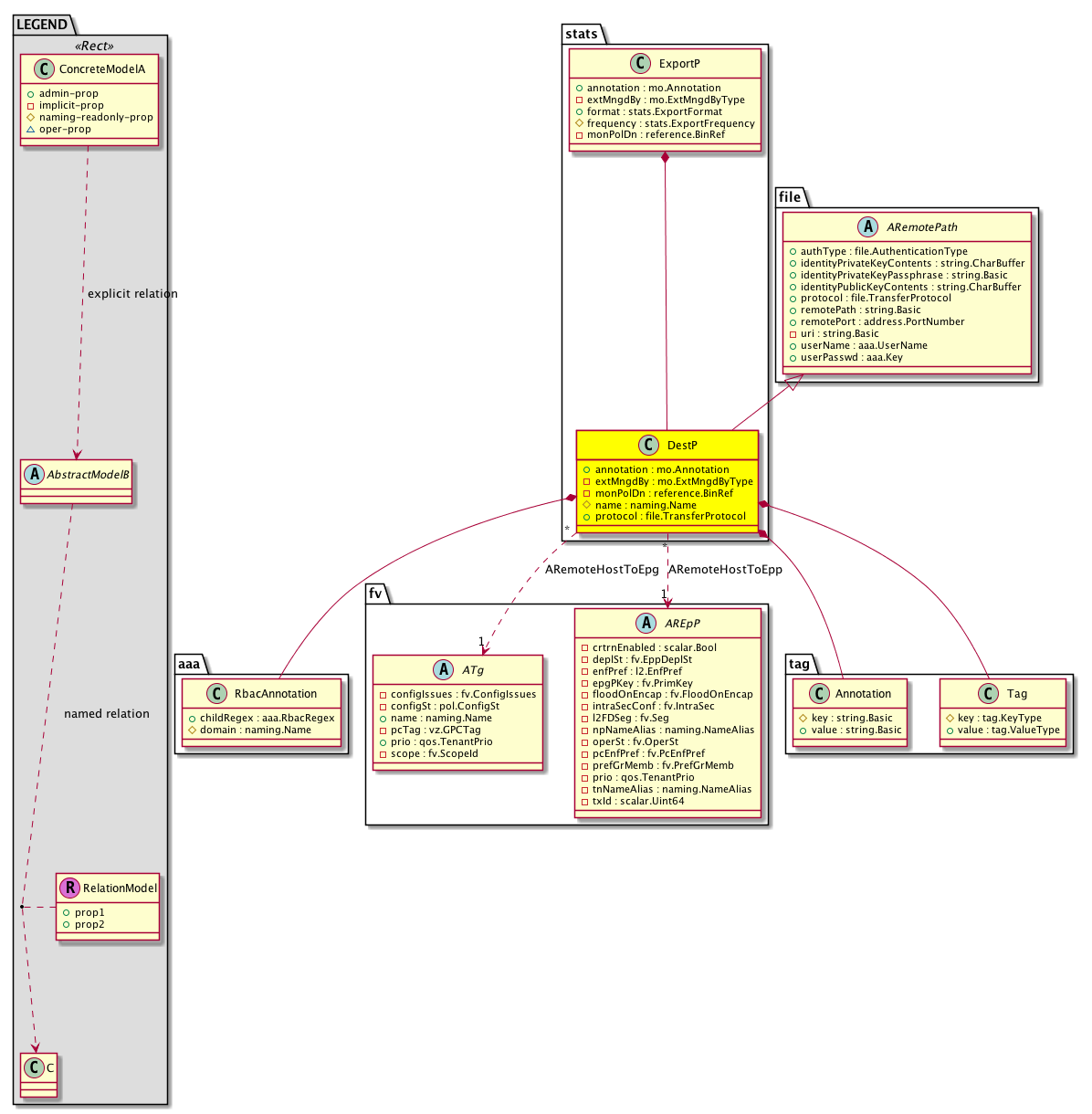 stats:DestP The export policy. The export policy enables you to output statistics collection policy reports in an XML or JSON format. The reports are exported at a specified frequency and to a chosen export destination.