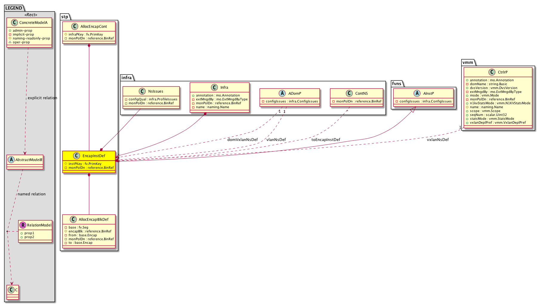 fvns:RtVxlanNsDef A target relation to the namespace policy is used for managing the Encap (VXLAN, NVGRE, VLAN) ranges. |