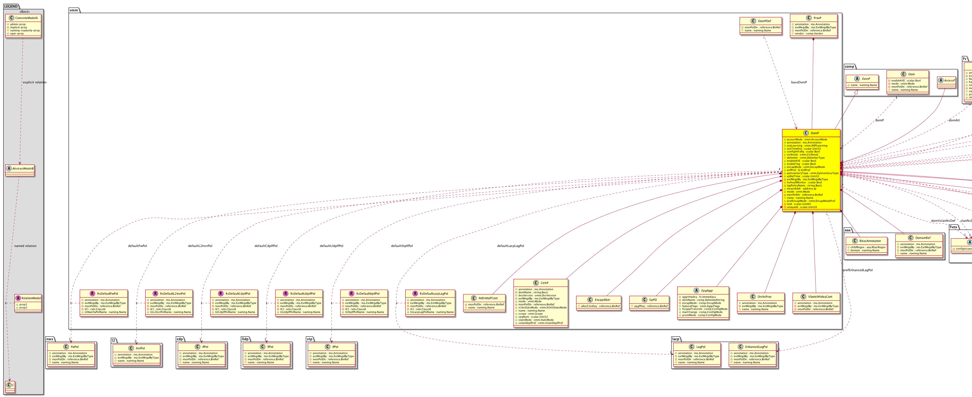vmm:RtDompRel A target relation to the VMM domain profile. The VMM domain profile is a policy for grouping VM controllers with similar networking policy requirements. For example, the VM controllers can share VLAN or VXLAN space and application endpoint groups. The APIC communicates with the controller to publish network configurations such as port groups that are then applied to the virtual workloads. Note that this relation is an internal object. |