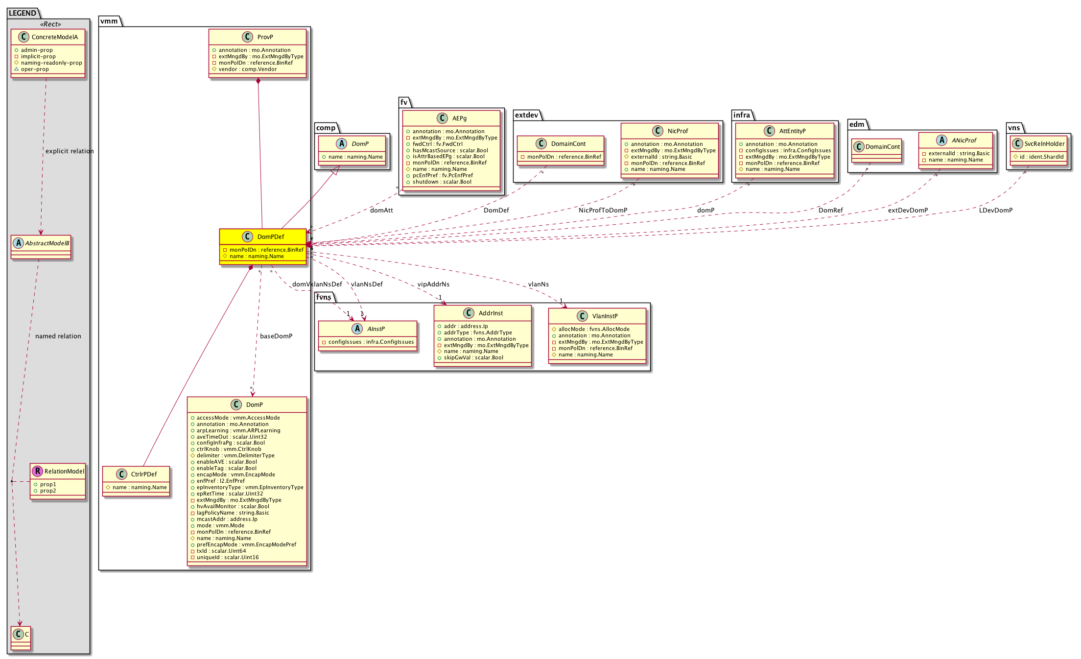 vmm:RsBaseDomP A source relation to the VMM domain profile. The VMM domain profile is a policy for grouping VM controllers with similar networking policy requirements. For example, the VM controllers can share VLAN or VXLAN space and application endpoint groups. The APIC communicates with the controller to publish network configurations such as port groups that are then applied to the virtual workloads. Note that this relation is an internal object. |