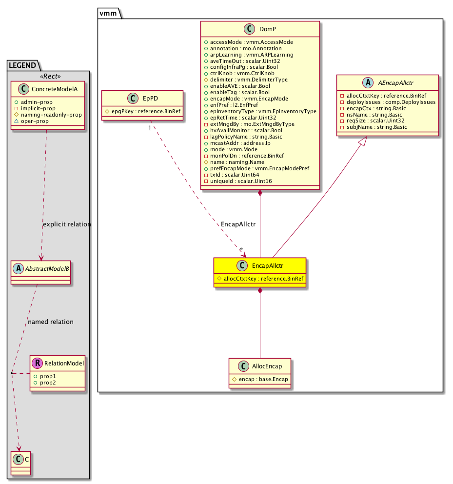 Super Mo: vmm:AEncapAllctr, Container Mos: vmm:DomP (deletable:yes), Contained Mos: vmm:AllocEncap, Relations From: vmm:EpPD, Relations: vmm:RtEncapAllctr, |