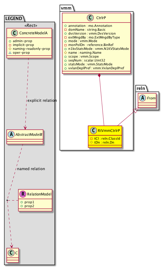 [V] vmm:RtVmmCtrlrP A target relation to the VMM controller profile. The VMM controller profile is a policy pertaining to a single VM management domain that also corresponds to a single policy enforcement domain. A cluster of VMware VCs forms such a domain. Note that this relation is an internal object.