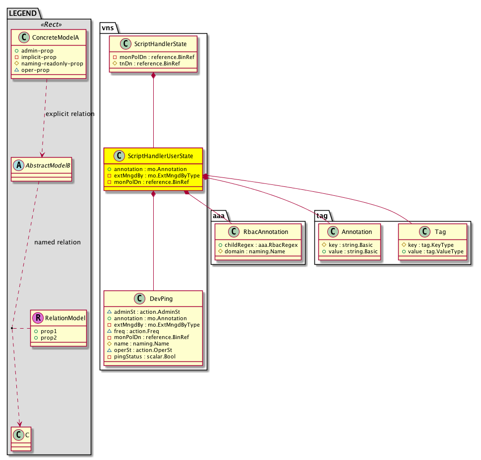 [V] vns:ScriptHandlerState The internal state of the script handler daemon. The script handler daemon handles the configuration of service nodes (firewall, load balancer etc.,) in the fabric. This object is for internal use only.