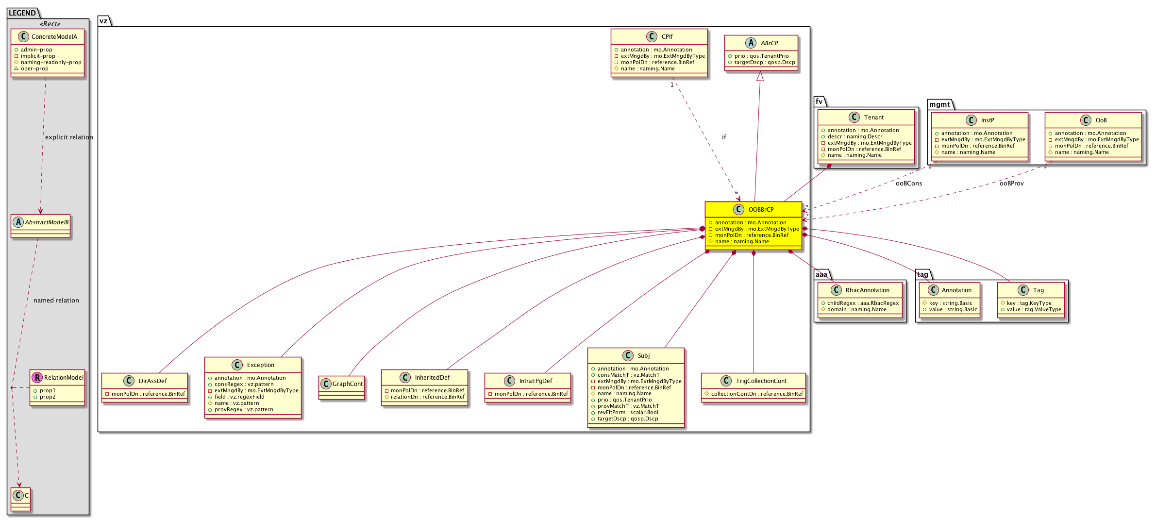 vz:OOBBrCP An out-of-band binary contract profile can only be provided by an out-of-band endpoint group and can only be consumed by the external prefix set. A regular endpoint group cannot provide or consume an out-of-band contract profile. |