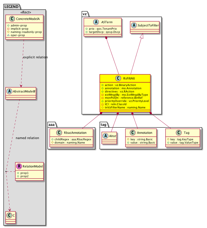 vz:RsFiltAtt A source relation to a filter. A filter is a group of resolvable filter entries. Each filter entry is a combination of network traffic classification properties. Note that this relation is an internal object. |