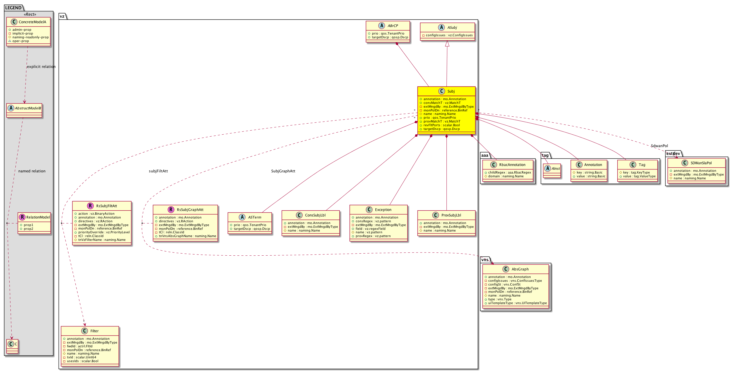 vz:ConsSubjLbl A consumer subject label. In general, a subject label is used as a classification criteria for subjects being consumed/provided by the endpoint groups (EPGs) participating in the contract. The label identifies a subject being consumed by a consumer. It can be parented by 2 different methods. The first method is the relation between the consumer EPG and the contract that is used for filtering the subjects. A label should match either the subject n... |